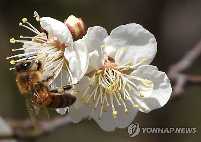 (창원=연합뉴스) 김동민 기자 = 경남지역 최고기온이 15도까지 오르는 등 포근한 날씨를 보인 25일 오후 경남 창원시 마산합포구 월포동 한 아파트 단지 내 매화나무에서 벌 한마리가 식사하고 있다. 2021.1.25