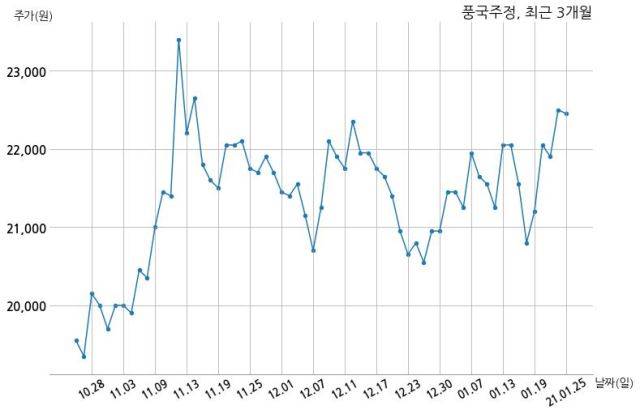 한편, 풍국주정의 14시 42분 현재주가는 22,450원으로 직전 거래일 대비 50원(-0.22%) 하락이며, 거래량은 291,649주이다.