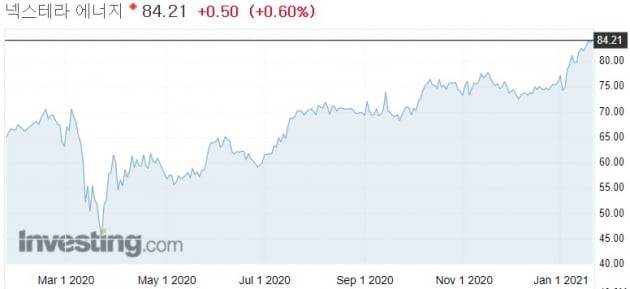 BoA에 따르면 넥스테라 에너지는 2022년까지 신재생에너지 등 인프라 투자에 500억달러(약 55조원) 이상을 투자할 예정이다. 뒤물린-스미스는 “바이든 행정부의 신재생에너지 정책 실행과 수소에너지 도입에 대한 논의는 넥스테라 에너지의 주가 상승을 이끄는 촉매 역할을 할 것”이라고 덧붙였다.