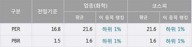 전일 종가를 기준으로 이 종목의 PER는 16.8배, PBR은 1.5배이다. PER는 화학업종의 평균 PER 21.6배 대비 -4.8배 낮은 수준으로 업종 내에서 하위 1%에 있고, PBR은 화학업종의 평균 PBR 1.6배 대비 -0.1배 낮은 수준으로 업종 내에서 하위 1%에 위치한다. 보통 낮은 PER는 현재 시장이 해당 기업의 가치를 상대적으로 낮게 평가하고 있다고 해석될 수 있다.