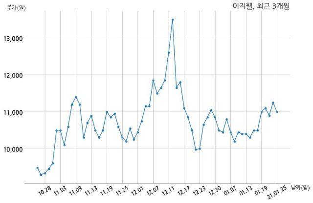 한편, 이지웰의 14시 54분 현재주가는 11,050원으로 직전 거래일 대비 200원(-1.78%) 하락이며, 거래량은 280,243주이다.