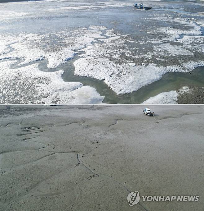 사진은 지난 6일 눈과 얼음으로 뒤덮인 예단포 선착장 모습(위)과 25일 다시 갯벌을 드러낸 예단포 선착장 모습(아래). 2021.1.25