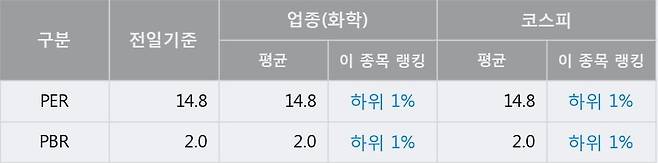 전일 종가를 기준으로 이 종목의 PER는 14.8배, PBR은 2.0배이다. PER는 화학업종의 평균 PER 14.8배와 동일한 수준으로 업종 내에서 하위 1%에 있고, PBR은 화학업종의 평균 PBR 2.0배와 동일한 수준으로 업종 내에서 하위 1%에 위치한다. 보통 낮은 PER는 현재 시장이 해당 기업의 가치를 상대적으로 낮게 평가하고 있다고 해석될 수 있다.