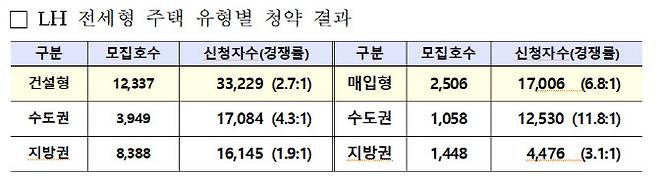 LH는 지난 18~20일 3일간 건설형 1만2337가구, 매입형 2506가구 등 전국 1만4843가구의 전세형 주택에 대해 권역별 입주자를 모집, 총 5만235명이 신청해 전국 평균 3.4대1의 경쟁률로 청약을 마감했다.