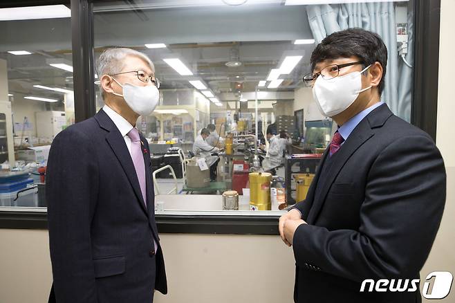 (서울=뉴스1) = 최기영 과학기술정보통신부 장관이 25일 오후 대전광역시 유성구 한국천문연구원에서 열린 '제3회 과학기술미래포럼'에서 최영준 우주과학본부장으로부터 '진공챔버 실험실'에 대한 설명을 듣고 있다. (과학기술정보통신부 제공) 2021.1.25/뉴스1