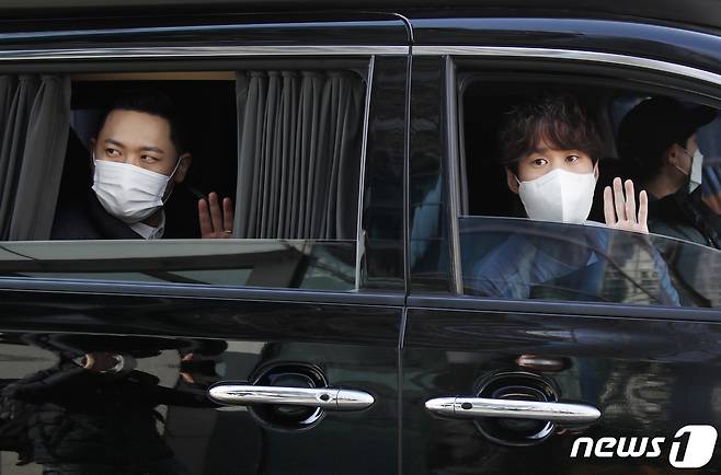 (서울=뉴스1) 권현진 기자 = 에픽하이 미쓰라, 타블로(오른쪽)가 25일 오후 서울 목동 SBS에서 열린 SBS 파워FM '두시탈출 컬투쇼'를 마친 뒤 퇴근을 하며 인사를 하고 있다. 2021.1.25/뉴스1