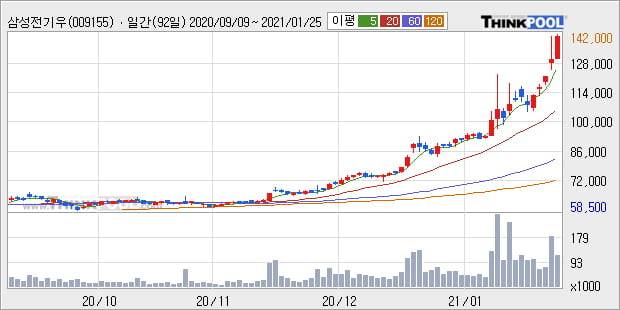 '삼성전기우' 52주 신고가 경신, 단기·중기 이평선 정배열로 상승세