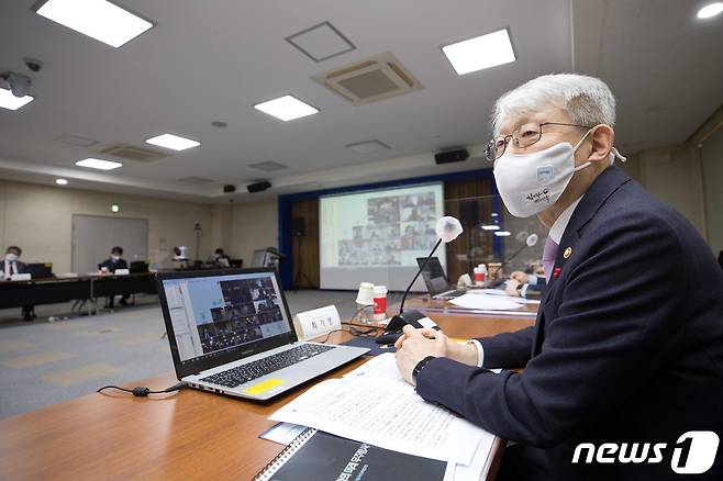 (서울=뉴스1) = 최기영 과학기술정보통신부 장관이 25일 오후 대전광역시 유성구 한국천문연구원에서 열린 '제3회 과학기술미래포럼'에서 '우주탐사의 과학적 경제적 가치'를 주제로 우주과학탐사분야 전문가들과 토론 하고 있다. (과학기술정보통신부 제공) 2021.1.25/뉴스1