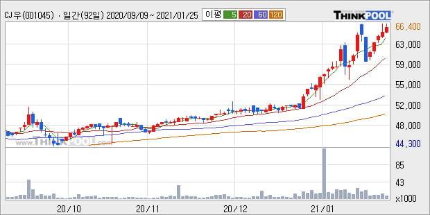 'CJ우' 52주 신고가 경신, 단기·중기 이평선 정배열로 상승세