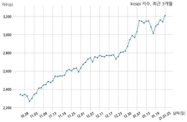 25일 코스피(3,208.99p, +68.36p, +2.18%)는 기관 매수 우위 속에 전 거래일보다 +68.36p 상승한 3,208.99p로 장을 마감했다.