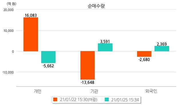 투자자별 동향을 살펴보면 기관은 3,591억원 순매수했으며, 외국인도 2,369억원 순매수했다.