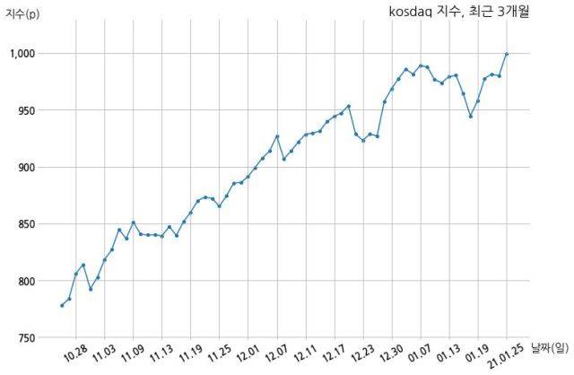 25일 코스닥(999.30p, +19.32p, +1.97%)은 기관 매수 우위 속에 전 거래일보다 +19.32p 상승한 999.30p로 장을 마감했다.