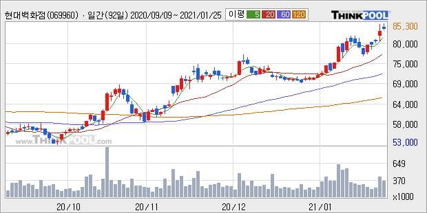 '현대백화점' 52주 신고가 경신, 전일 종가 기준 PER 12.8배, PBR 0.4배, 업종대비 저PER