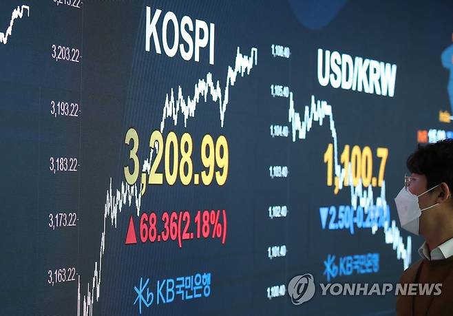 (서울=연합뉴스) 황광모 기자 = 코스피가 3,200을 돌파한 25일 오후 서울 영등포구 여의도 KB국민은행 스마트 딜링룸의 전광판에 이날 코스피와 원/달러 환율이 표시돼 있다. 2021.1.25