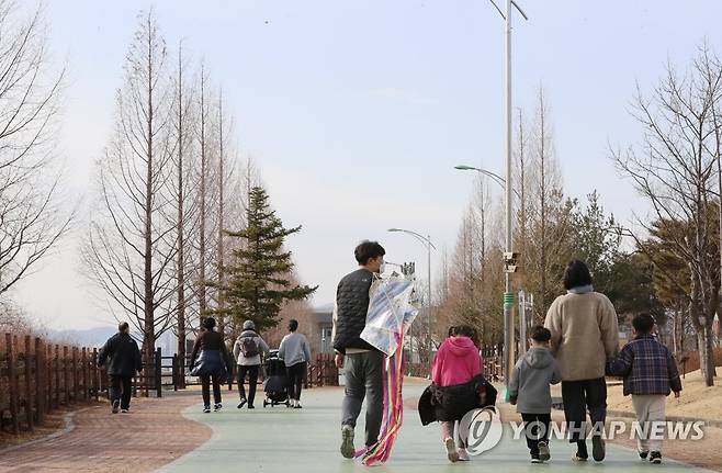 (청주=연합뉴스) 천경환 기자 = 25일 오후 청주시 문암생태공원에서 시민들이 가벼운 옷차림으로 산책하고 있다. 2021.1.25