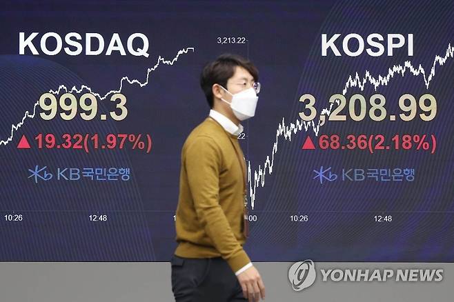 (서울=연합뉴스) 황광모 기자 = 코스피가 3,200을 돌파한 25일 오후 서울 영등포구 여의도 KB국민은행 스마트 딜링룸의 전광판에 이날 코스피와 코스닥 지수가 표시돼 있다. 2021.1.25