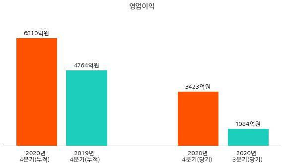 2020년 4분기 영업이익은 3423억원으로 동년 3분기 영업이익 1084억원 대비 2339억원 증가했다.