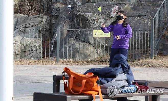 (청주=연합뉴스) 천경환 기자 = 25일 오후 청주시 문암생태공원에서 한 아이가 두꺼운 옷을 벗고 배드민턴을 치고 있다. 2021.1.25