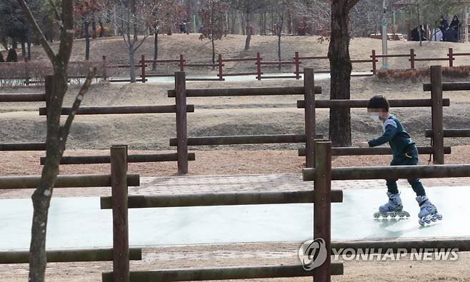 (청주=연합뉴스) 천경환 기자 = 25일 오후 청주시 문암생태공원에서 한 아이가 가벼운 옷차림으로 인라인스케이트를 타고 있다. 2021.1.25