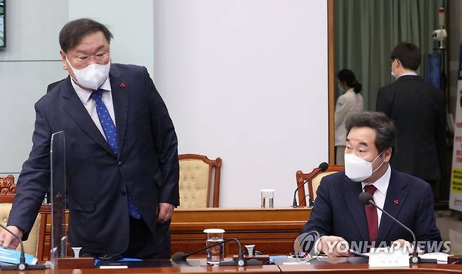 (서울=연합뉴스) 이진욱 기자 = 더불어민주당 이낙연 대표(오른쪽)와 김태년 원내대표가 25일 오후 청와대에서 열린 복지부·식약처·질병청 2021년 업무보고에 참석해 있다. 2021.1.25