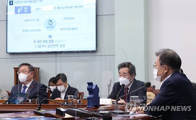 (서울=연합뉴스) 이진욱 기자 = 문재인 대통령과 더불어민주당 이낙연 대표가 25일 오후 청와대에서 열린 복지부·식약처·질병청 2021년 업무보고에서 정은경 질병관리청장 보고를 받고 있다. 2021.1.25