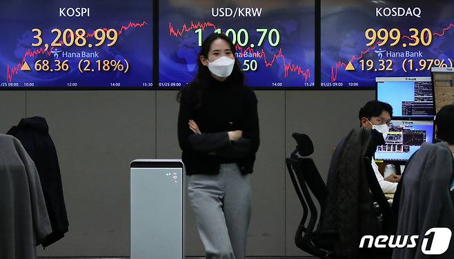 (서울=뉴스1) 오대일 기자 = 코스피가 14일 만에 3,200선을 돌파하며 종가 기준 사상 최고치를 기록한 25일 오후 서울 중구 하나은행 딜링룸 전광판의 코스피 지수가 전 거래일 대비 68.36포인트(2.18%) 오른 3208.99를 나타내고 있다. 이날 코스닥 지수도 전 거래일 대비 19.32포인트(1.97%) 오른 999.30로 사상 최고치를 기록하며 장을 마쳤다. 2021.1.25/뉴스1