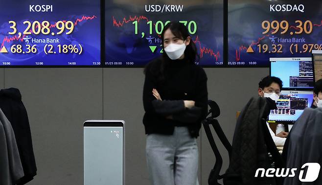 (서울=뉴스1) 오대일 기자 = 코스피가 14일 만에 3,200선을 돌파하며 종가 기준 사상 최고치를 기록한 25일 오후 서울 중구 하나은행 딜링룸 전광판의 코스피 지수가 전 거래일 대비 68.36포인트(2.18%) 오른 3208.99를 나타내고 있다. 이날 코스닥 지수도 전 거래일 대비 19.32포인트(1.97%) 오른 999.30로 사상 최고치를 기록하며 장을 마쳤다. 2021.1.25/뉴스1