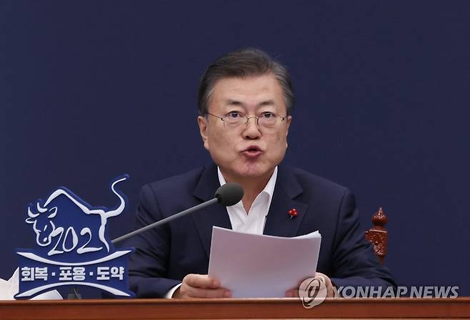 (서울=연합뉴스) 이진욱 기자 = 문재인 대통령이 25일 오후 청와대에서 열린 복지부·식약처·질병청 2021년 업무보고에서 발언하고 있다. 2021.1.25