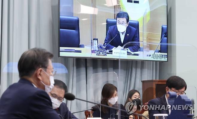 (서울=연합뉴스) 이진욱 기자 = 문재인 대통령이 25일 오후 청와대에서 열린 복지부·식약처·질병청 2021년 업무보고에 참석, 권덕철 보건복지부 장관 보고를 받고 있다. 2021.1.25