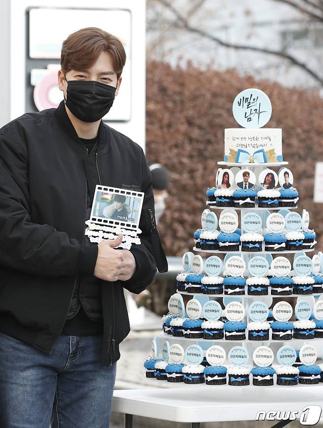 (서울=뉴스1) 권현진 기자 = 배우 강은탁이 25일 서울 여의도 KBS 별관에서 열린 KBS 2TV 일일 드라마 ‘비밀의 남자’ 녹화 중간 휴식 시간을 틈타 팬들이 보내준 커피차 앞에서 포즈를 취하고 있다. 2021.1.25/뉴스1