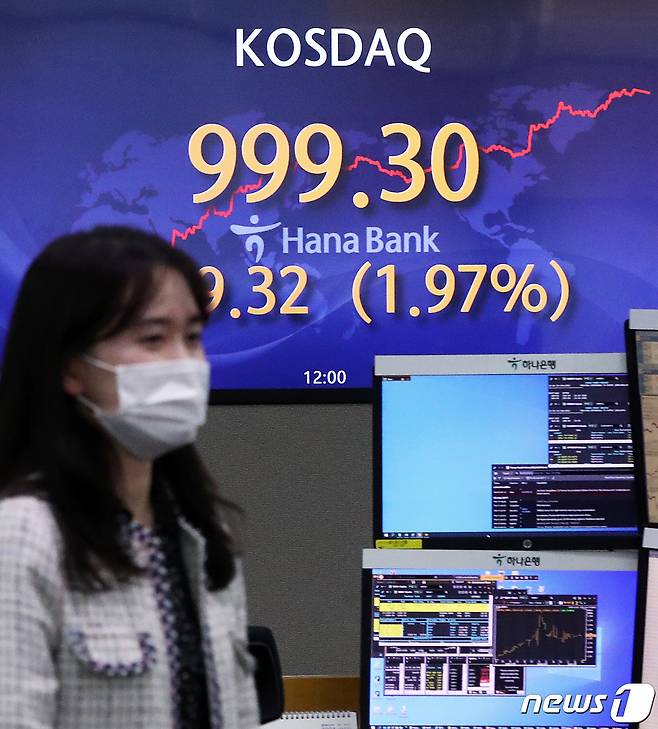 (서울=뉴스1) 오대일 기자 = 코스피가 14일 만에 3,200선을 돌파하며 종가 기준 사상 최고치를 기록한 25일 오후 서울 중구 하나은행 딜링룸 전광판의 코스닥 지수가 전 거래일 대비 19.32포인트(1.97%) 오른 999.30로 사상 최고치를 나타내고 있다. 2021.1.25/뉴스1