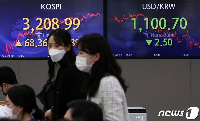 (서울=뉴스1) 오대일 기자 = 코스피가 14일 만에 3,200선을 돌파하며 종가 기준 사상 최고치를 기록한 25일 오후 서울 중구 하나은행 딜링룸 전광판의 코스피 지수가 전 거래일 대비 68.36포인트(2.18%) 오른 3208.99를 나타내고 있다. 이날 코스닥 지수도 전 거래일 대비 19.32포인트(1.97%) 오른 999.30로 사상 최고치를 기록하며 장을 마쳤다. 2021.1.25/뉴스1
