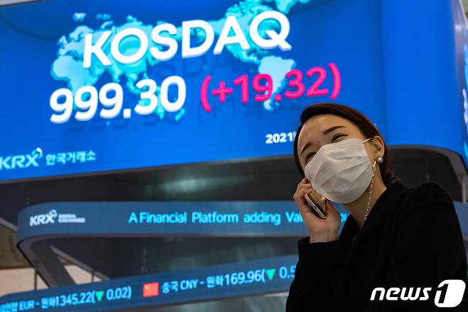 이날 원·달러 환율은 2.5원 내린 1100.7원, 코스닥은 19.325포인트(1.97%) 오른 999.30으로 마감했다. 2021.1.25/뉴스1