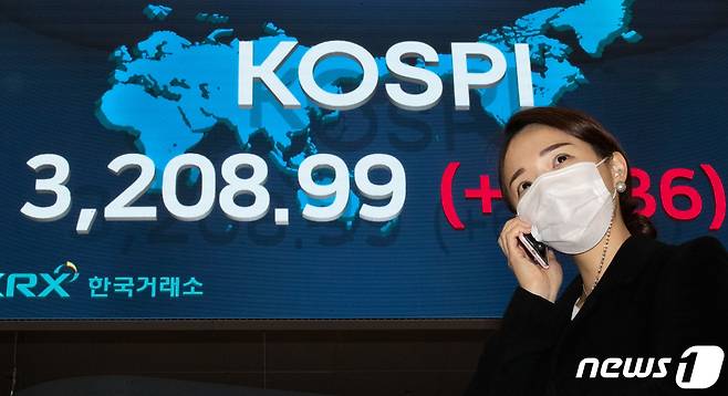 (서울=뉴스1) 이재명 기자 = 코스피지수가 3,200을 돌파한 25일 오후 서울 영등포구 여의도 한국거래소 전광판에 코스피지수가 전 거래일 대비 68.36포인트(2.18%) 오른 3,208.99를 나타내고 있다.