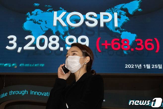 (서울=뉴스1) 이재명 기자 = 코스피지수가 3,200을 돌파한 25일 오후 서울 영등포구 여의도 한국거래소 전광판에 코스피지수가 전 거래일 대비 68.36포인트(2.18%) 오른 3,208.99를 나타내고 있다.