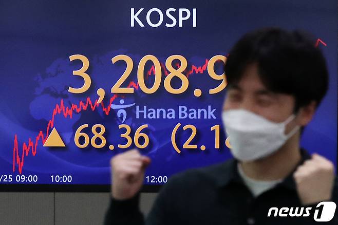 (서울=뉴스1) 오대일 기자 = 코스피가 14일 만에 3,200선을 돌파하며 종가 기준 사상 최고치를 기록한 25일 오후 서울 중구 하나은행 딜링룸 전광판의 코스피 지수가 전 거래일 대비 68.36포인트(2.18%) 오른 3208.99를 나타내고 있다. 이날 코스닥 지수도 전 거래일 대비 19.32포인트(1.97%) 오른 999.30로 사상 최고치를 기록하며 장을 마쳤다. 2021.1.25/뉴스1