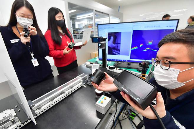 자율주행차의 눈인 '라이다' 기술 개발에 국내 기업이 박차를 가하고 있다. 라이다는 가격이 비싸고 원천 기술이 없어 대부분 해외 업체에 의존하고 있는 실정이다. 25일 인천 연수구 카네비컴 연구개발(R&D)센터에서 연구원이 라이다 파형 측정과 센서 광파워 성능 평가를 하고 있다.