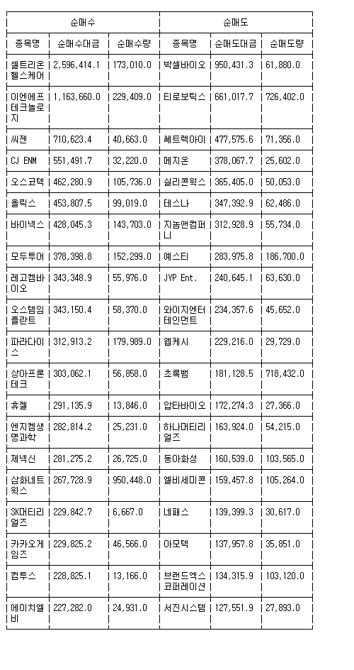 [표] 코스닥 기관 순매수도 상위종목(25일)