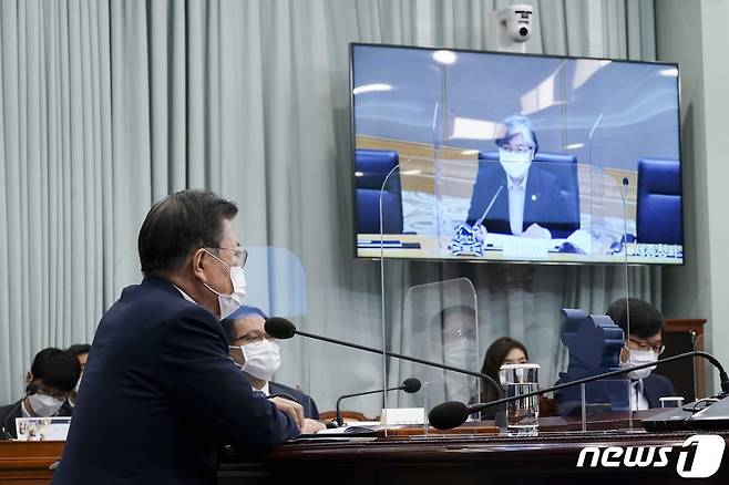 (서울=뉴스1) 이광호 기자 = 문재인 대통령이 25일 오후 청와대에서 열린 보건복지부·식품의약품안전처·질병관리청 2021년 업무보고에 참석해 정은경 질병관리청장의 보고를 받고 있다. 2021.1.25/뉴스1