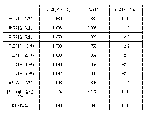 5년물과 1년물은 각각 2.7bp 상승, 보합으로 연 1.353%, 연 0.689%에 마감했다.