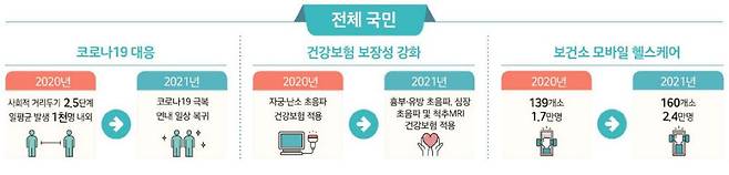 보건복지부는 25일 2021년 업무계획 보고에서 코로나19 조기 극복을 통한 일상 회복과 보건복지 디지털 뉴딜 가속화를 목표로 내걸었다. 복지부는 식품의약품안전처, 질병관리청과 함께 백신·치료제 조기 도입, 전국민 무료 예방접종 시행을 최우선과제로 시행한다. '포스트 코로나' 시대에 대비해 바이오헬스 산업 육성, 보건의료 데이터 활용 지원을 통한 개인 맞춤형 정밀의료 촉진, D.N.A(데이터, 네트워크, 인공지능)를 결합한 스마트 의료·복지도 확대한다.