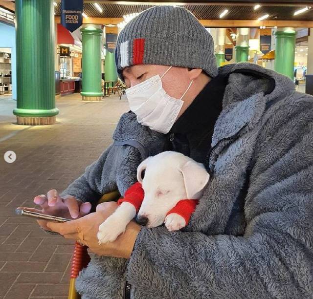 김경록 씨의 품이 편안한 듯 잠든 반려견의 모습은 평화롭고 화목한 분위기로 훈훈함을 자아냈다. 김경록 씨는 명품로고가 눈에 띄는 모자로 반려견과 깔맞춤을 자랑했다.