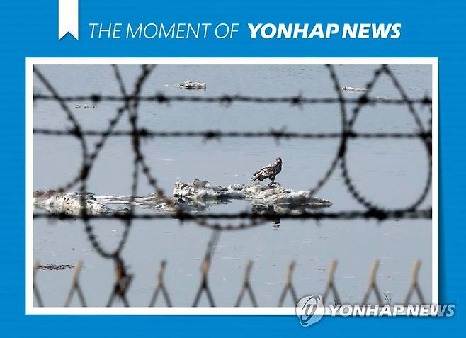 (파주=연합뉴스) 백승렬 기자 = 서울 낮 기온이 영상 11도까지 올라갈 것으로 예보된 25일 오전 경기도 파주시를 지나는 한강에서 흰꼬리수리 한 마리가 유빙을 타고 하류로 내려가고 있다. 2021.1.25 [THE MOMENT OF YONHAPNEWS]