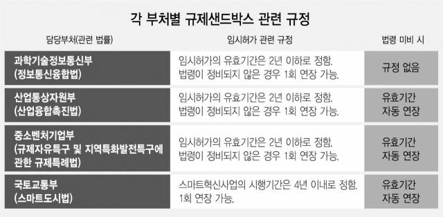 과기정통부 소관 법률은 규제샌드박스 임시허가를 최대 1회(2년)만 연장 가능하도록 규정해 놓았다. 아울러 과기정통부가 임시허가 기간 내에 관련 법률을 개정하지 못할 경우 임시허가를 연장하는 조항이 없다. 이에 따라 과기정통부 규제샌드박스를 통해 사업에 뛰어든 기업들은 최대 4년 간 적법하게 사업을 할 수 있지만, 그 이후는 사업의 영속성을 보장받지 못한다. 반면 산업자원통상부·중소벤처기업부 등은 임시허가 연장이 무기한 가능해 이 같은 불안 요소가 없어 부처별 규제샌드박스 제도의 형평성 문제도 제기된다.