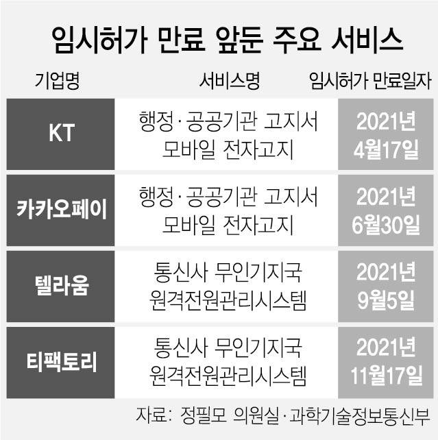 당장 KT 모바일 전자고지 서비스(4월), 카카오페이 전자고지 서비스(6월) 등 임시허가를 받아 운영 중인 서비스들의 임시허가 기간만료는 코앞으로 다가온 상황이다. 임시허가 1회 연장을 받아 2023년까지 기간을 늦출 수는 있지만 여전히 기업들에게는 사업 영속성에 대한 불확실성이 커 큰 부담이다. 스타트업 업계는 “서비스를 유지하고 투자를 유치하는 데 4년이라는 기한이 존재하는 것은 상당한 불안요소”라고 입을 모은다.
