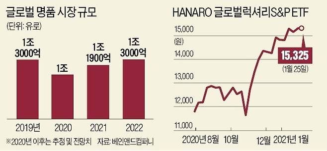 글로벌 명품 기업에 투자하는 펀드의 수익률도 상승세다. NH아문디자산운용이 작년 5월 상장한 ‘HANARO 글로벌럭셔리 S&P 상장지수펀드(ETF)’는 작년 11월 이후 약 3개월 동안 30.2%의 수익을 올렸다. 이 펀드는 명품 및 고급 서비스를 생산·유통하는 80개 글로벌 기업에 투자하는 상품으로, 국내에서는 아모레퍼시픽 호텔신라 강원랜드 신세계 파라다이스 5개 기업을 담고 있다. 이 펀드에 편입된 종목 가운데는 아모레퍼시픽(19.41%)과 호텔신라(7.53%)가 연초 수익률 상승에 기여하고 있다.