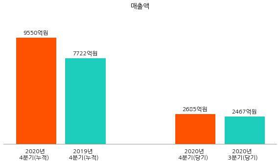 분기별 실적의 경우 2020년 4분기 매출액은 2685억원으로 동년 3분기 매출액 2467억원 대비 218억원(8.8%) 증가했다. 2020년 4분기 영업이익은 617억원으로 동년 3분기 영업이익 625억원 대비 8억원 감소했다.