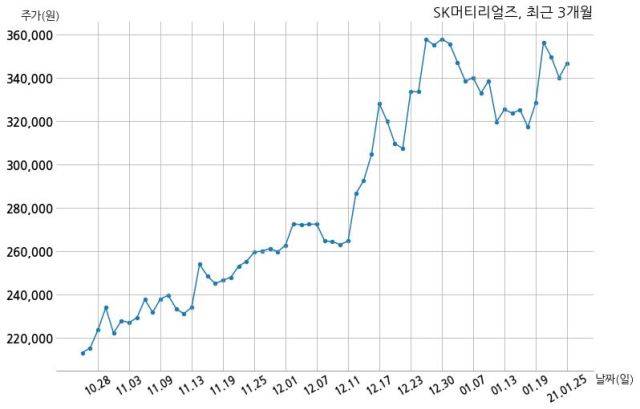 한편, SK머티리얼즈는 장 마감 이후 해당 기업공시를 발표했으며 오늘 종가가 346,600원, 거래량은 38,881주로, 직전 거래일 대비 6,600원(+1.94%) 상승했다.