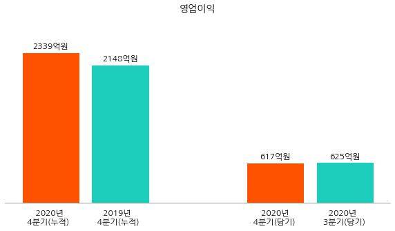 2020년 4분기 영업이익은 617억원으로 동년 3분기 영업이익 625억원 대비 8억원 감소했다.
