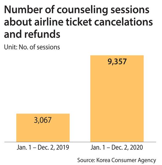 After purchasing a 7-million-won ($6,360) travel package via an online shopping platform in January last year, a customer was not able to get a refund after canceling due to the pandemic. He sent a damage relief application to the tourism company and the online shopping platform through the Korea Consumer Agency, but it was returned, and he’s still out of money. In a study published by the Korea Consumer Agency on Sunday, conflicts between consumers and online shopping platforms over the past five years were analyzed to determine the type of conflicts and the reasons for the conflicts. The number of relief applications it received totaled about 69,452. Of them, 12,974 were made last year, up 7 percent compared to a year earlier. Applications related to airlines totaled 5,898. Some 3,274 applications were made about investment consulting services, while 2,094 were made related to overseas travel. For airlines, a total of 2,187 damage relief applications were filed last year alone, more than a two-fold jump on year, mainly due to the cancelation of flights due to the prolonged coronavirus pandemic. By types of damage, some 63.6 percent of applications were related to contract disputes, 5.1 percent about service quality and after-sales service while roughly 3.6 percent were about safety issues. It also turned out that 15.8 percent involved the nine big players: 11st, Naver, Auction, WeMakePrice, Interpark, Gmarket, Coupang, Kakao and TMON. Of them, some 40.8 percent of consumers were not able to receive full compensation due to unidentified sellers or sellers who dropped off the grid. Some 1,500 people applied for damage relief related to conflicts with overseas sellers, but 48.2 percent were not fully compensated. “Online platforms must actively mediate the relationship between sellers and consumers by fully revealing the personally identifiable information about the sellers,” the Korea Consumer Agency said in the analysis. “In the case of foreign businesses, they must hire a representative in the country so that the representative can actively respond to any conflicts with local consumers.” BY CHEA SARAH, LEE BYUNG-JUN [chea.sarah@joongang.co.kr]